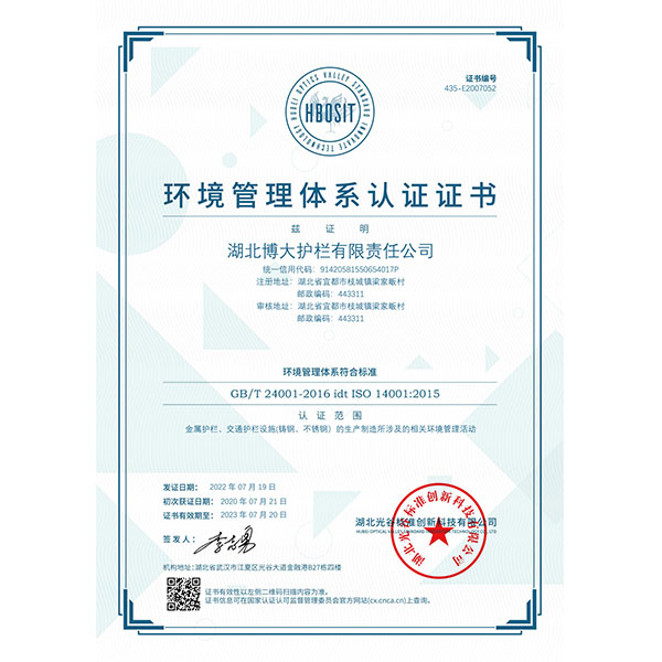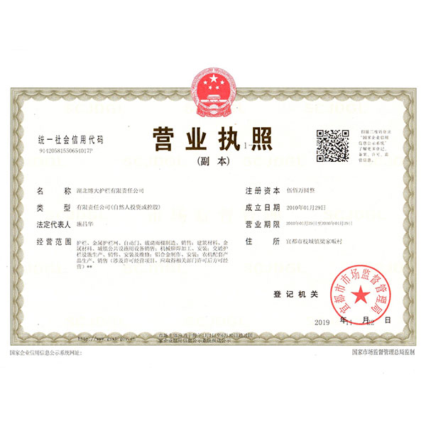 湖北博大護(hù)欄有限責(zé)任公司成立于2009年,注冊(cè)資本伍佰萬(wàn)元,是一家專(zhuān)業(yè)從事金屬護(hù)欄研制、生產(chǎn)及銷(xiāo)售為一體的高新技術(shù)企業(yè),公司位于湖北宜都市建材園區(qū),已形成交通護(hù)欄、公路護(hù)欄;樓盤(pán)護(hù)欄、百葉;玻璃產(chǎn)品;玻璃雨棚、中小型鋼構(gòu);園區(qū)柵欄、圍欄;鑄鐵井蓋、交通底座及相關(guān)交安設(shè)施等系列產(chǎn)品。廣泛適用于市政道路、橋梁、房地產(chǎn)及住宅小區(qū)、工業(yè)園區(qū)等場(chǎng)地的安全防護(hù)及裝飾美化。 博大護(hù)欄公司擁有護(hù)欄專(zhuān)用全自動(dòng)數(shù)控成套生產(chǎn)線(xiàn)、自動(dòng)噴涂線(xiàn)、自動(dòng)焊接設(shè)備等生產(chǎn)機(jī)械設(shè)備;在職員工110余人,專(zhuān)業(yè)技術(shù)人員20余名,年銷(xiāo)售額超5000多……